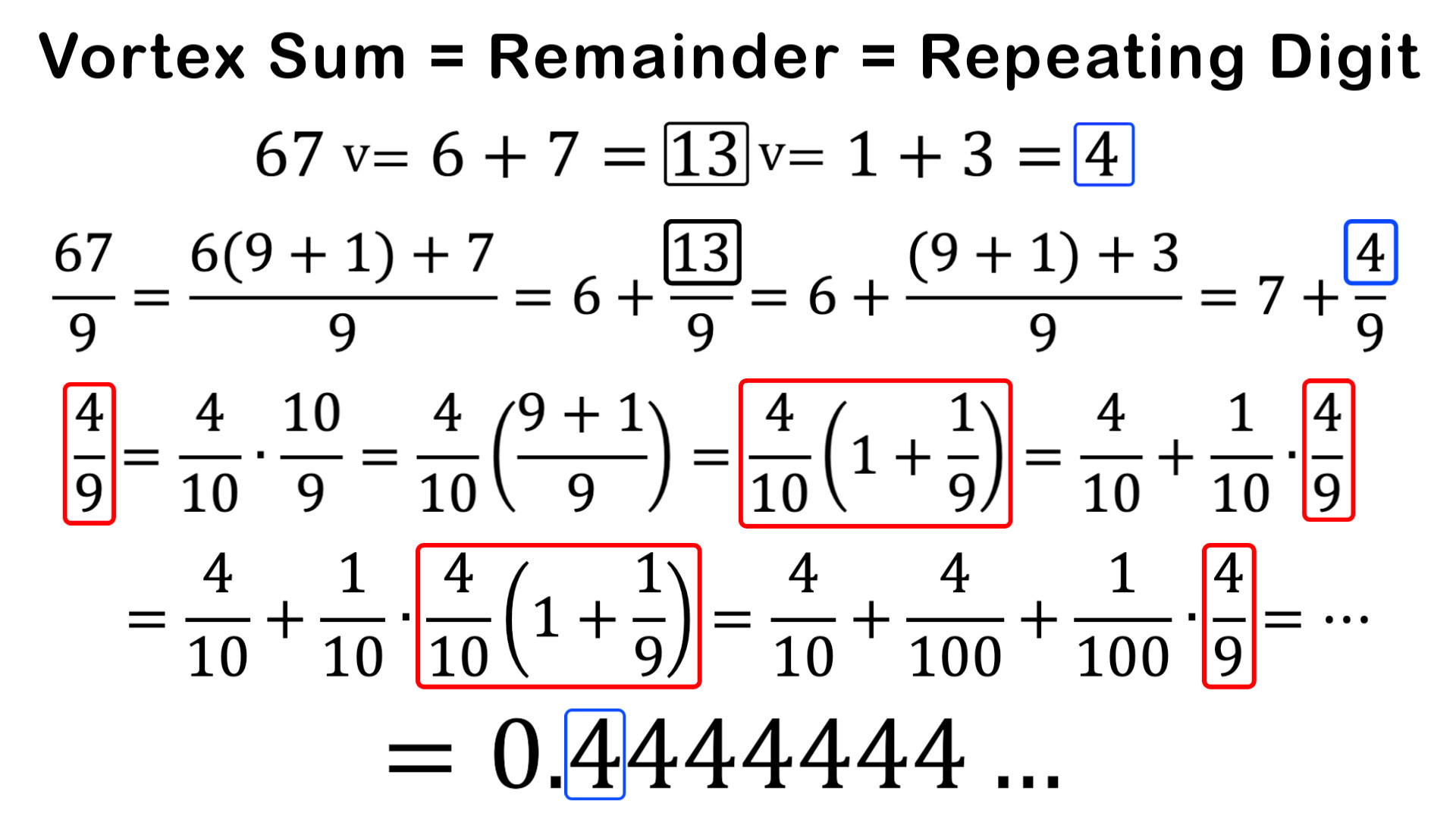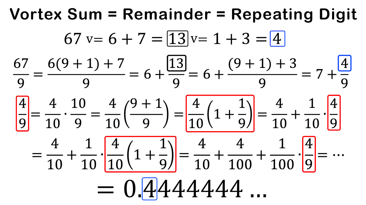 In this video I show that not only is the vortex sum (summing of digits a number until 1 digit remains) is the remainder when dividing by the largest single digit, but this same number repeats indefinitely after the decimal place. For example, 67 v= 6 + 7 = 13 v= 1 + 3 = 4, and 67/9 = 7.44444..., where the remainder is 4/9 and the repeating digit is 0.4444... This is in fact the same for any number system when dividing by the highest single digit. I show that this is due to the infinite loop that arises when dividing by the highest single digit of any number system, since the number after it is always the transition number 10. Fascinating stuff!
